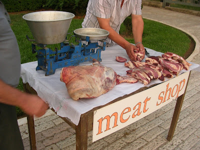 The work of Alban Muja, entitled “meat shop”, start from a displacement of the context of a daily action like to go to buy meat. The action consists in fact in inviting a butcher to move his activity on the sidewalk in front of the National Gallery. This kind of action show how the artist see the society, “another" look outside the same social system and for this reason deep and careful in catching those small particular that, emphasized, transform one small situation in the manifestation of a global problem. Muja places this accent in almost all his artistic production like in "Museum of Contemporary History" where a simple landscape photography becomes, with the intervention of the artist, a document on present and past history of Kosovo, or like in "Free your mind" where pronouncing all the names of the personages of the art world that he remembers, he constructs a bridge between his memory, his informations and all the things that the artistic “power" promotes and recognizes like art.
